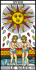 隱者緊接著就是命輪,命輪走了好長的距離才到太陽牌。不正好呼應了我們現在思量、沉澱,面對現實生活,還是要走向下一步的命輪「要怎樣收穫,先那樣栽」,然後經過了「春耕、夏耘、秋收、冬藏」,才能得到太陽般的光明人生嘛~隱者用心去等待、經營,才能看到太陽的歡娛、燦爛跟愉快~