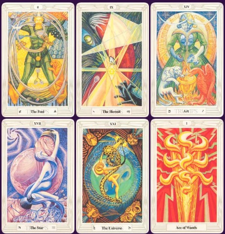 另外,直覺式塔羅所使用的塔羅牌是托特牌(Thoth Tarot),這是由金色曙光另外一位會員亞歷斯特.克勞利(Aleister Crowley )設計,由 Lady Frieda Harris 繪製。既然偉特跟托特的創作者不同,使用上自然也就不同,對初學者來說親切的入門牌種還是偉特。