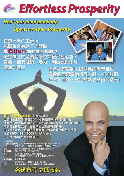 Bijan自2006年底以來,在台灣舉辦多次「輕而易舉的富足」工作坊,許多人的生命因此從此改變,體驗豐盛富足的奇蹟,獲得許多熱烈迴響!我們竭誠地邀請您來參加Effortless Prosperity工作坊﹝全程中文翻譯﹞