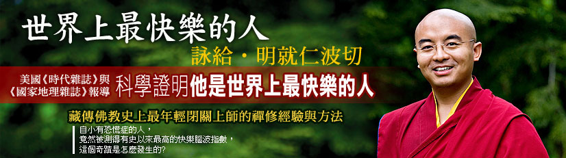 經科學檢驗、被美國「時代雜誌」譽為「世界上最快樂的人」的詠給.明就仁波切,曾為恐慌症困擾十三年,有時甚至想死,「都是靠禪修才變得快樂」。