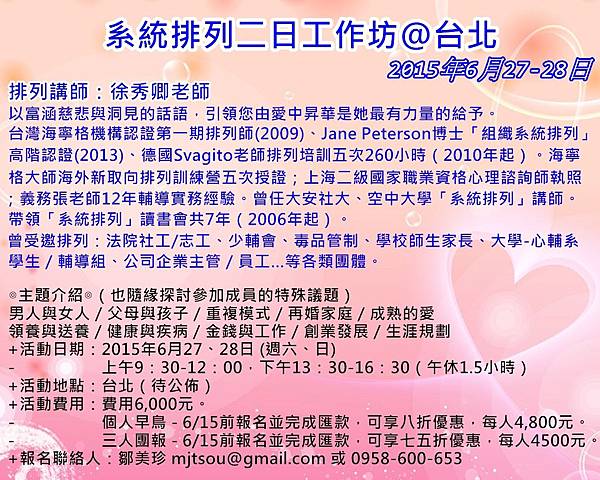 在家族系統排列的概念中,唯有站在正確的位置上,並且尊重系統裡的每一個人,才能創造出真正的幸福關係。本次工作坊將透過實際個案排列、感知活動(小排列)、講解分享體驗,共同學習如何運用「系統觀」創造出個人更幸福成功的生活、愛與關係。2015年6月,邀請您,與我們一起修煉愛的藝術,帶著家族的祝福,讓自己接上源源不絕的生命力,真正活出靈魂的熱情!